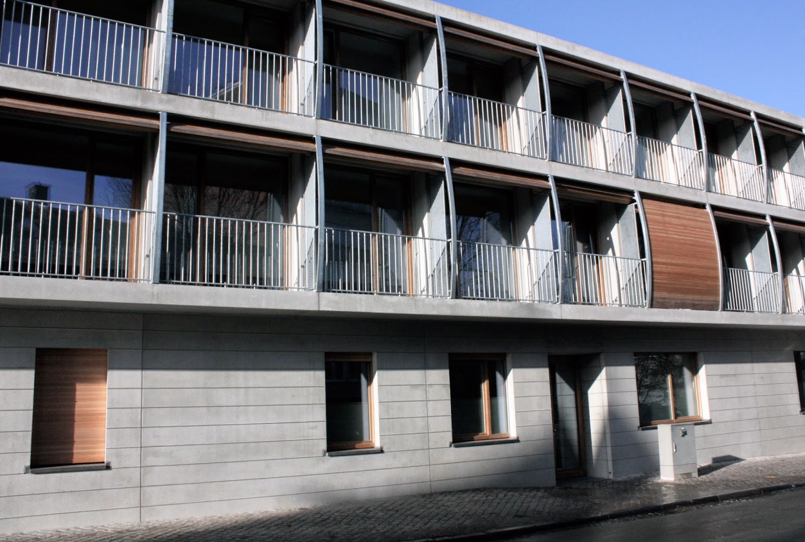 On apprécie ici la disposition en cascade des appartements et tout le jeu de volumes qui l’accompagne. Les briques rouges et la particularité du bois utilisé, l’afzelia, font que l’immeuble se remarque directement dans le quartier. Ici, c’est la terrasse qui est un des éléments clefs, car chaque appartement dispose d’un ou plusieurs balcon(s) avec vue dégagée, et pas des moindres : le panorama offert sur Liège est immanquable.