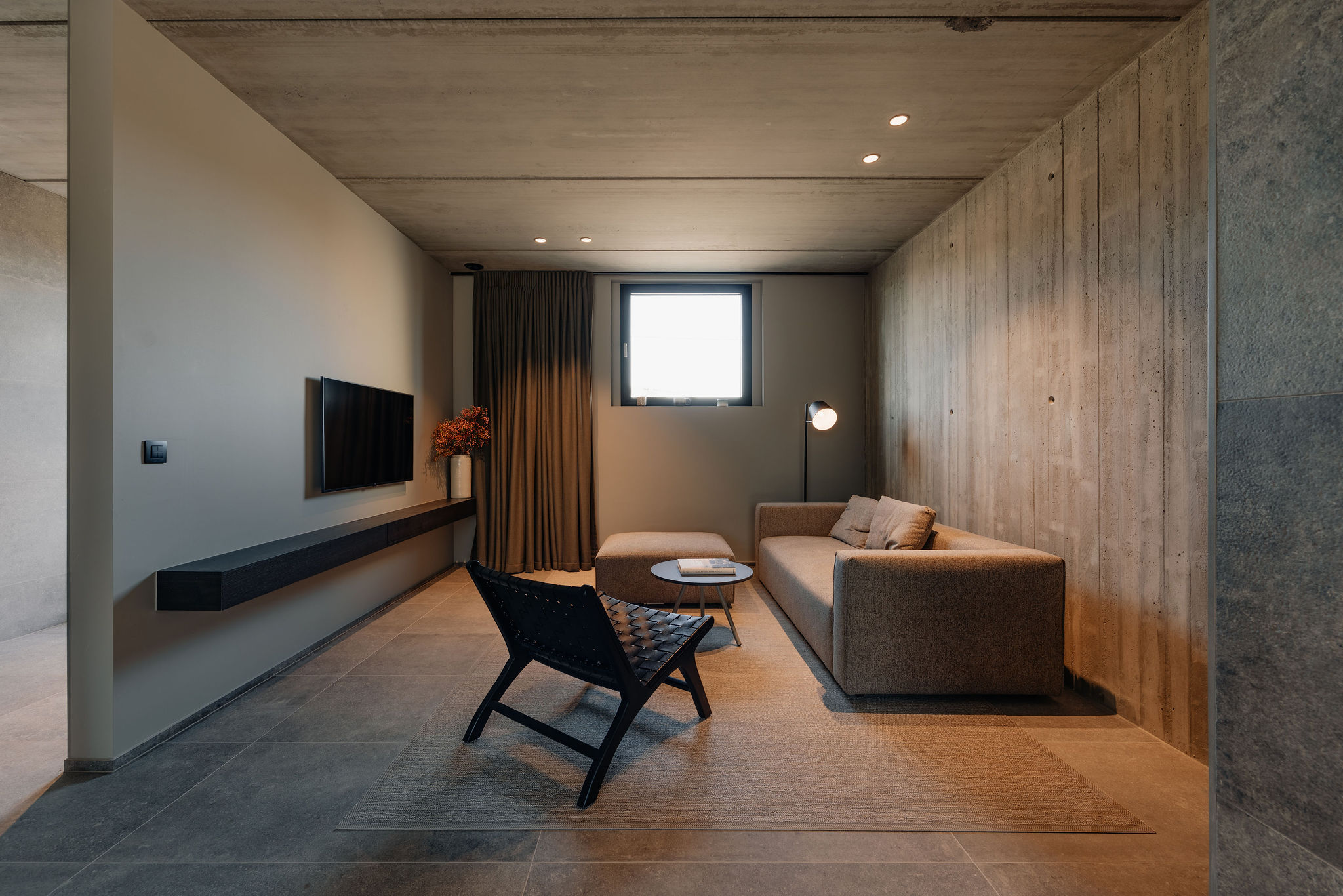 Béton brut, carrelages effet métal, nuances chaleureuses, photographies noir et blanc : L’Échappée Mosane revisite l’esthétique industrielle dans une version feutrée.