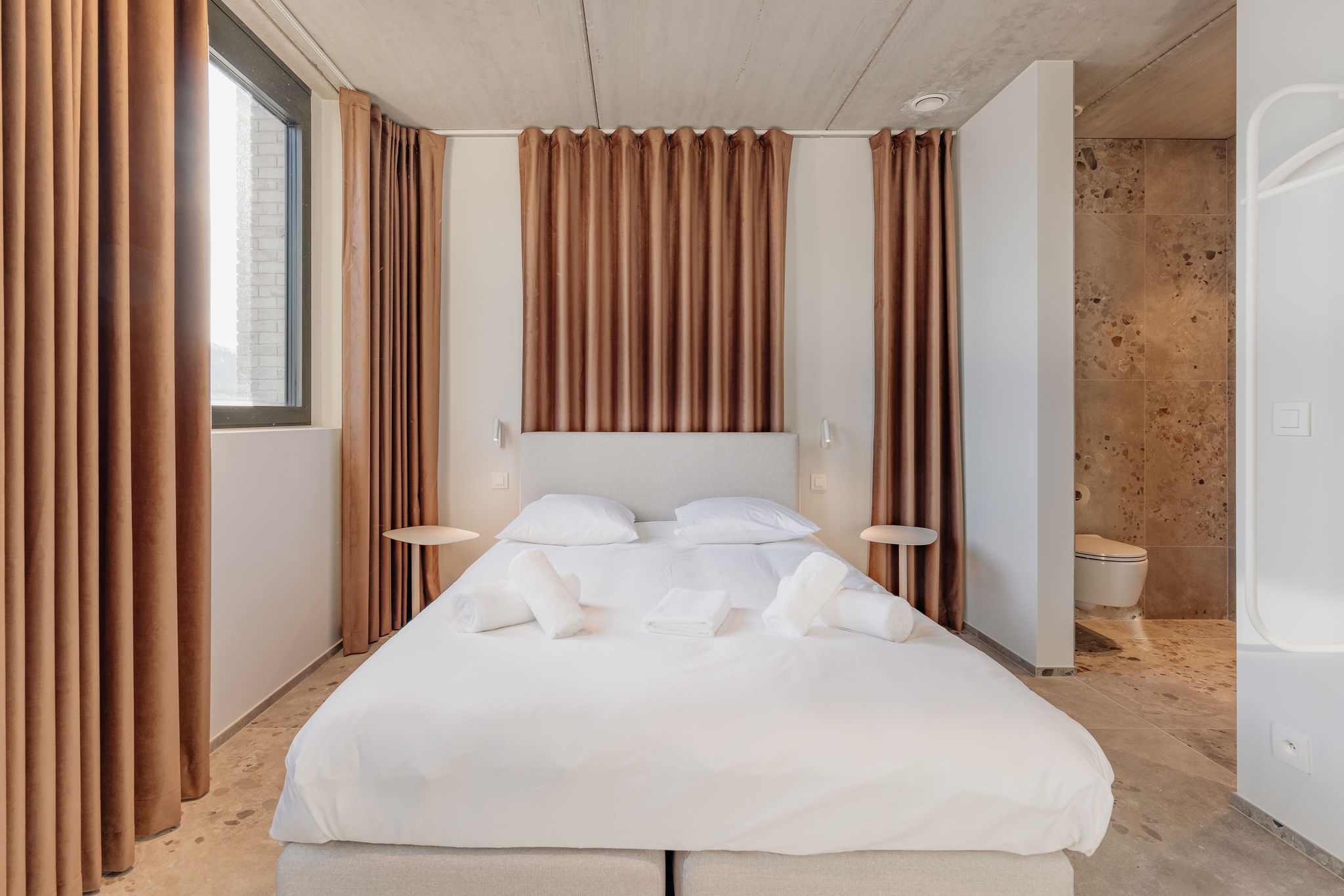 Ici, tout est matière. La cuisine graphique structure l’espace. Les chambres prolongent cette écriture sobre avec des salles de bain entièrement carrelées, des rideaux épais et des détails métalliques. Pensez loft confortable, sans froideur.