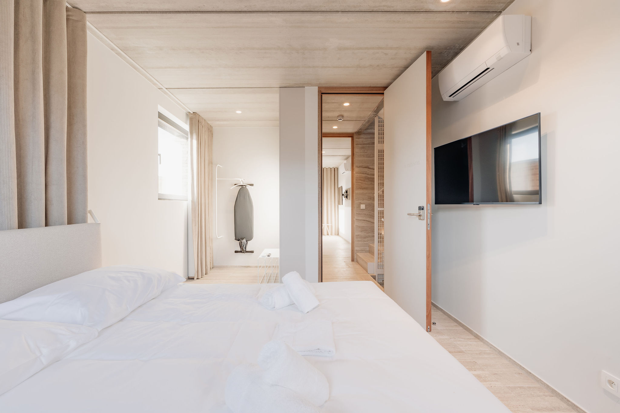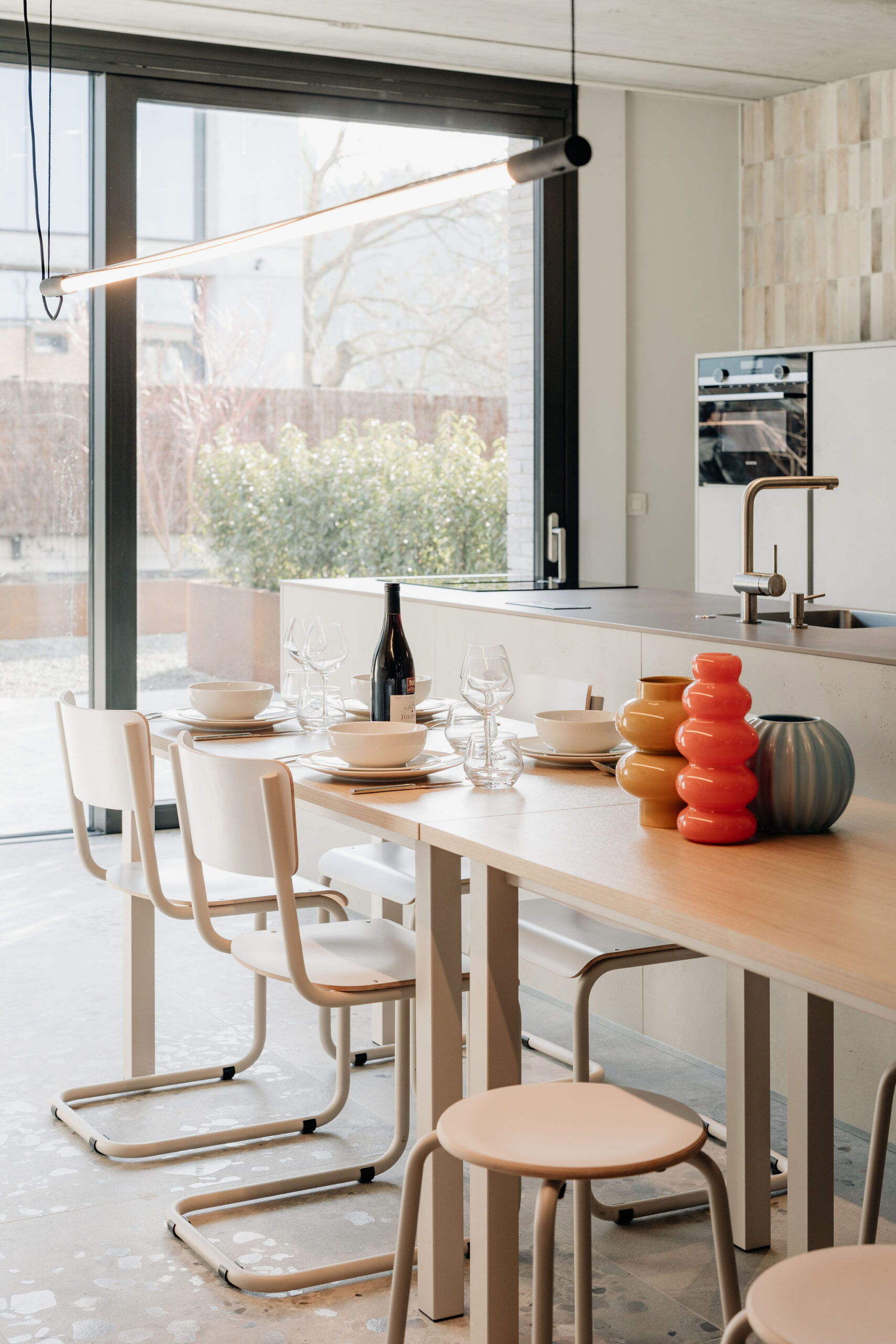 La grande table centrale devient tour à tour espace de réunion, de repas ou de discussions qui s’éternisent. Les chambres, plus feutrées, offrent un contrepoint calme, avec une attention particulière portée à l’acoustique et à la lumière.