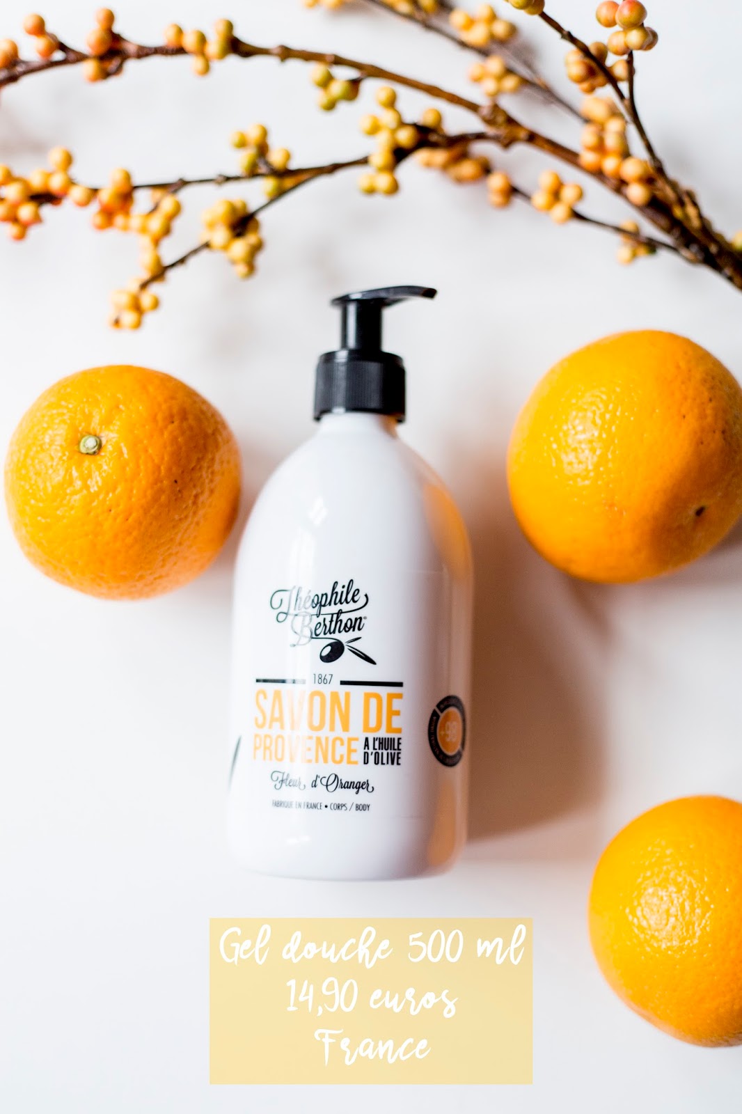 Le gel douche Théophile Berton, a, en plus d’avoir un nom sympathique, une senteur qui nous emmène pour un aller simple en Provence. La fleur d’oranger sent la vraie fleur d’oranger. La texture est plus grasse, puisque le gel est essentiellement composé d’huile d’olive. Ca ne mousse pas comme nos gels douches habituels et miracles, mais deux pressions suffisent pour nettoyer le corps et le nourrir au passage, grâce à ses composantes. Moi qui était une abonnée aux petites plaques rouges après la douche, c’est désormais de l’histoire ancienne.